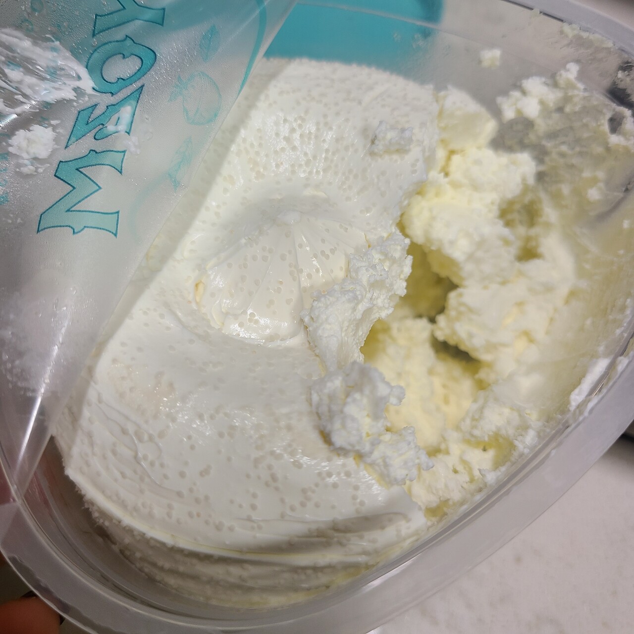 그릭요거트를 만들 때 우유 속 유청이 대다수 소거되기고 하니 유당불내증 있는 사람들도 먹을 수 있는 유제품이고요. 일반 요거트는 유청이 제거되지 않고 그대로 섭취해요. 그릭요거트는 여기서 수분을 사라지게해준답니다, 여기서 걸러지는 수분이 유청입니다. 이 유청이 없어지기때문에 유당불내증도 섭취가 가능해요. 가능한 수분인 유청을 제거했기에 꾸덕한 질감, 크림치즈 같은 질감으로 나옵니다.